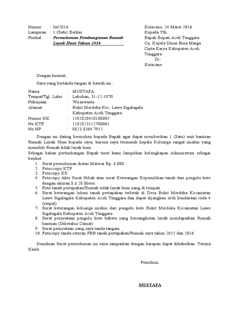 Mengingat rumah saya yang sangat memprihatinkan dan menghawatirkan karena usia bangunan yang sudah lama dan telah rusak berat apalagi ketika musim hujan atap genteng pada bocor untuk itu saya memberanikan diri mengajukan permohonan bantuan kepada Bapak Bupati agar saya bisa membangun rumah yang layak dan nyaman untuk ditempati. Semoga Berikut ini Anda bisa lansung Copypaste Contoh Surat Permohonan Bantuan Rumah Layak Huni Semoga contoh surat ini dapat melengkapi administrasi Anda. Contoh Surat Permohonan Tempat Tinggal Semoga berikut ini anda bisa lansung copypaste contoh surat permohonan bantuan rumah layak huni semoga contoh surat ini dapat melengkapi administrasi anda.