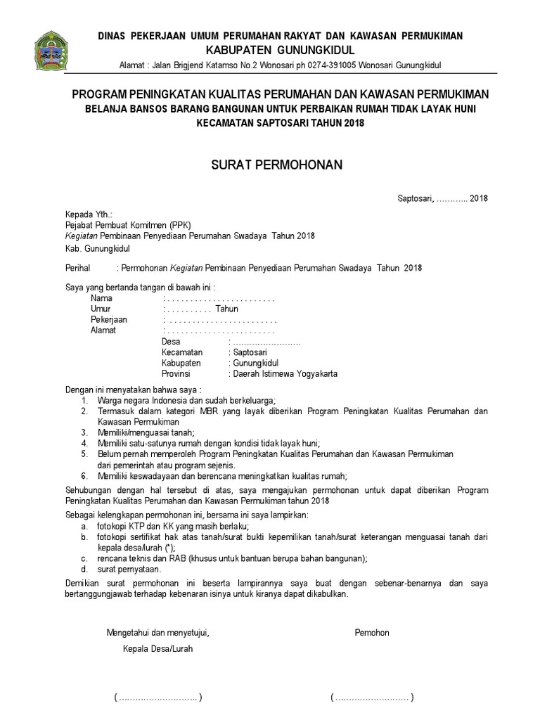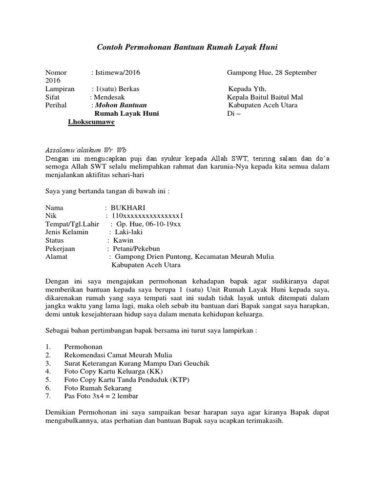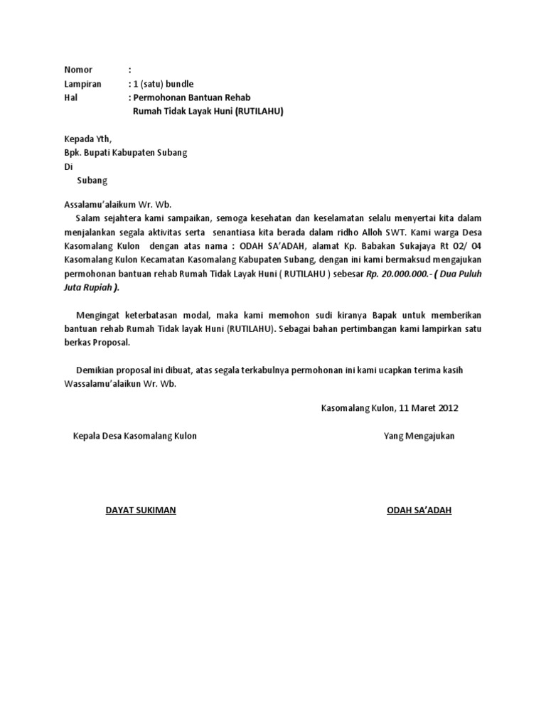 Demikian proposal ini kami sampaikan semoga dijadikan bahan pertimbangan untuk terkabulnya permohonan ini karena sangat besar harapan kami proposal bantuan Pembangunan Rumah Tidak Layak Huni ini dapat terrealisasi. SURAT PERMOHONAN REHAB RUMAH. Cari Blog Ini Contoh LENGKAP Surat Permohonan Bedah Rumah Tidak Layak Huni Oleh Ahmad Jalaluddin Rumi.