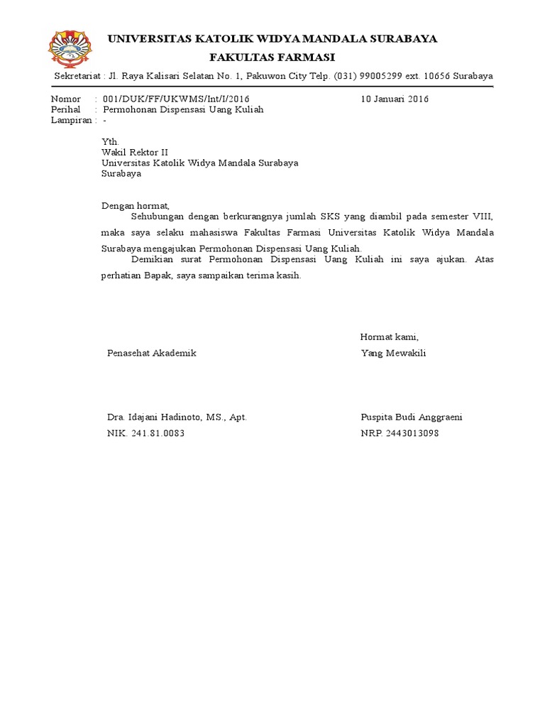 Contoh surat permohonan dispensasi biaya kuliah. Surat ini ditujukan secara pribadi kepada pihak kampus sehingga harus menginformasikan data pribadi secara detail. Berdasar dari hal tersebut maka kita bisa menyimpulkan tujuan. Surabaya 4 Mei 2017.