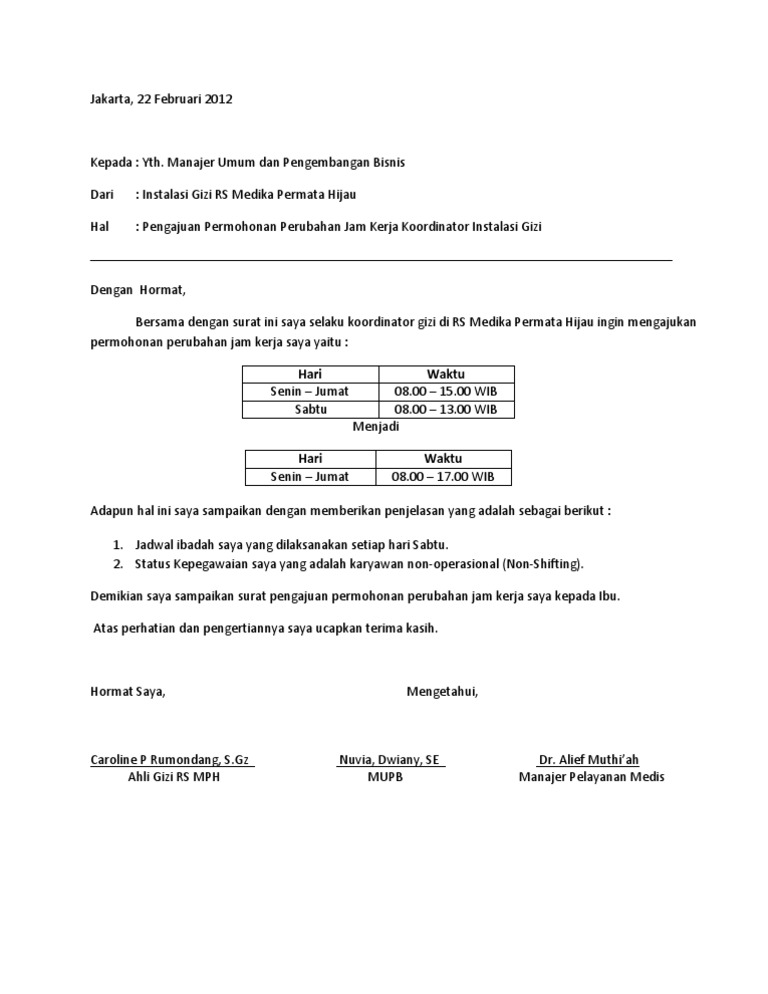 Misalnya saja dalam perkuliahan dimana mahasiswa diberikan kebebasan untuk tidak masuk kuliah selama periode tertentu dikarenakan alasan yang tentunya harus jelas. 5 Phone 022 6866951 Fax. Pengajuan Permohonan Perubahan Jam kerja Dengan hormat Saya yang bertanda tangan dibawah ini.