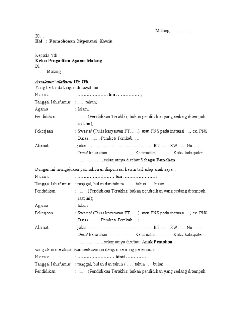 Contoh surat permohonan dispensasi nikah di pengadilan agama. MA mencatat ada peningkatan jumlah perkara dispensasi kawin yang diputus Pengadilan dari 23126 perkara 2019 menjadi 35441 2020. PERMOHONAN DISPENSASI NIKAH Perihal. Ketua Pengadilan Agama Trenggalek Di Trenggalek Assalamuallaikum Wr.