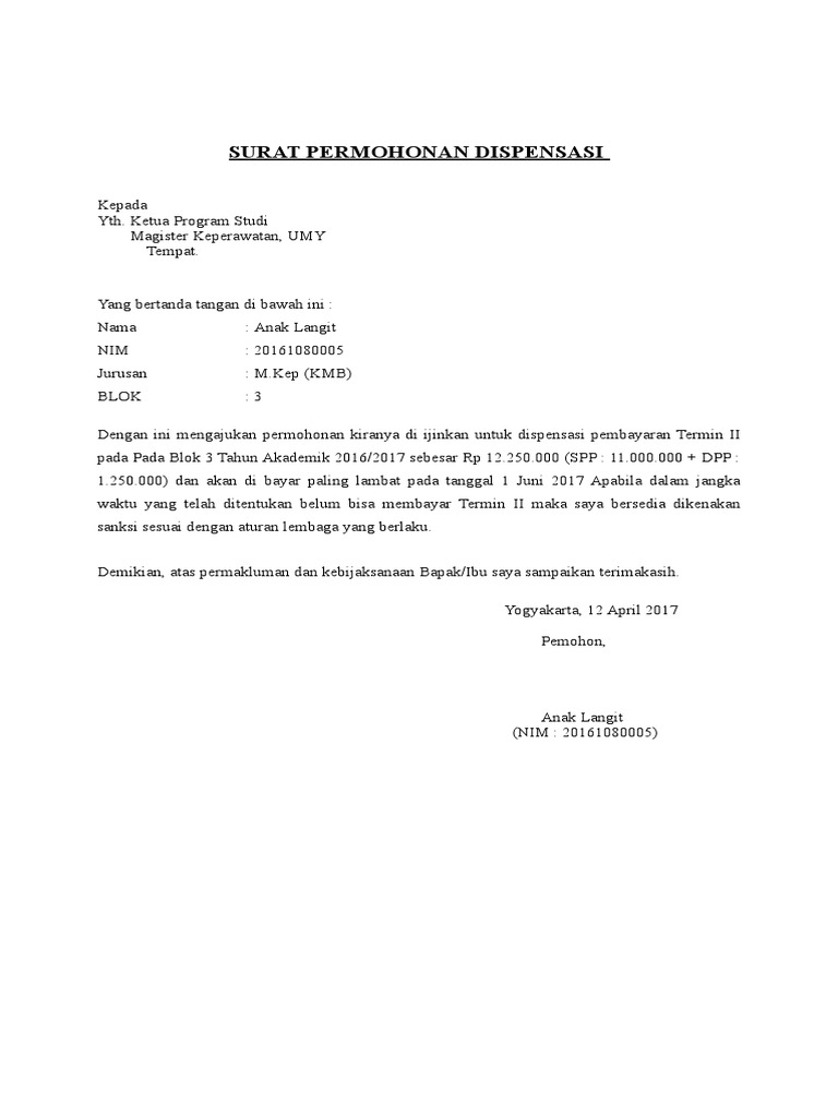 Contoh surat permohonan dispensasi pembayaran spp. Contoh Surat Dispensasi Pembayaran Spp Kuliah. Pasal 13 Peraturan Direktur Jenderal Perbendaharaan Nomor PER-37PB2014 tentang Pedoman Pelaksanaan Penerimaan dan Pengeluaran Negara Akhir Tahun Anggaran 2014 telah mengatur batas waktu penyampaian SPM-LS oleh Pejabat Penandatangan Surat Perintah Membayar PPSPM ke Kantor Pelayanan Perbendaharaan Negara KPPN sebagai berikut. Admin dari blog bagikan contoh 2019 juga mengumpulkan gambar gambar lainnya terkait contoh surat permohonan penundaan pembayaran spp kuliah dibawah ini.
