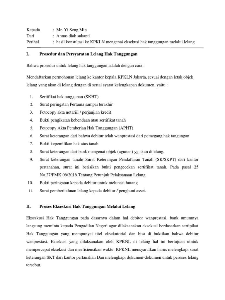 Apabila pemegang hak tanggungan pertama telah membuat janji untuk tidak dibersihkan Pasal 1210 BW dan Pasal 11 ayat 2j Undang-undang Nomor 4 Tahun 1996 Tentang Hak Tanggungan maka apabila ada hak tanggungan lain- lainnya dan hasil lelang tidak cukup untuk membayar semua hak tanggungan yang membebani tanah yang bersangkutan maka hak. Hak kebendaan yang diikat dengan hak tanggungan sebagai penjamin pelunasan utang bagi kreditur jika debitur peminjam uang cidera janji wanprestasi maka debitur pemegang hak tanggungan dapat mengambil atau memperoleh pelunasan piutangnya dari hasil penjualan benda. Contoh Surat Permohonan Lelang Eksekusi Hak Tanggungan dari Kreditur Perbankan.