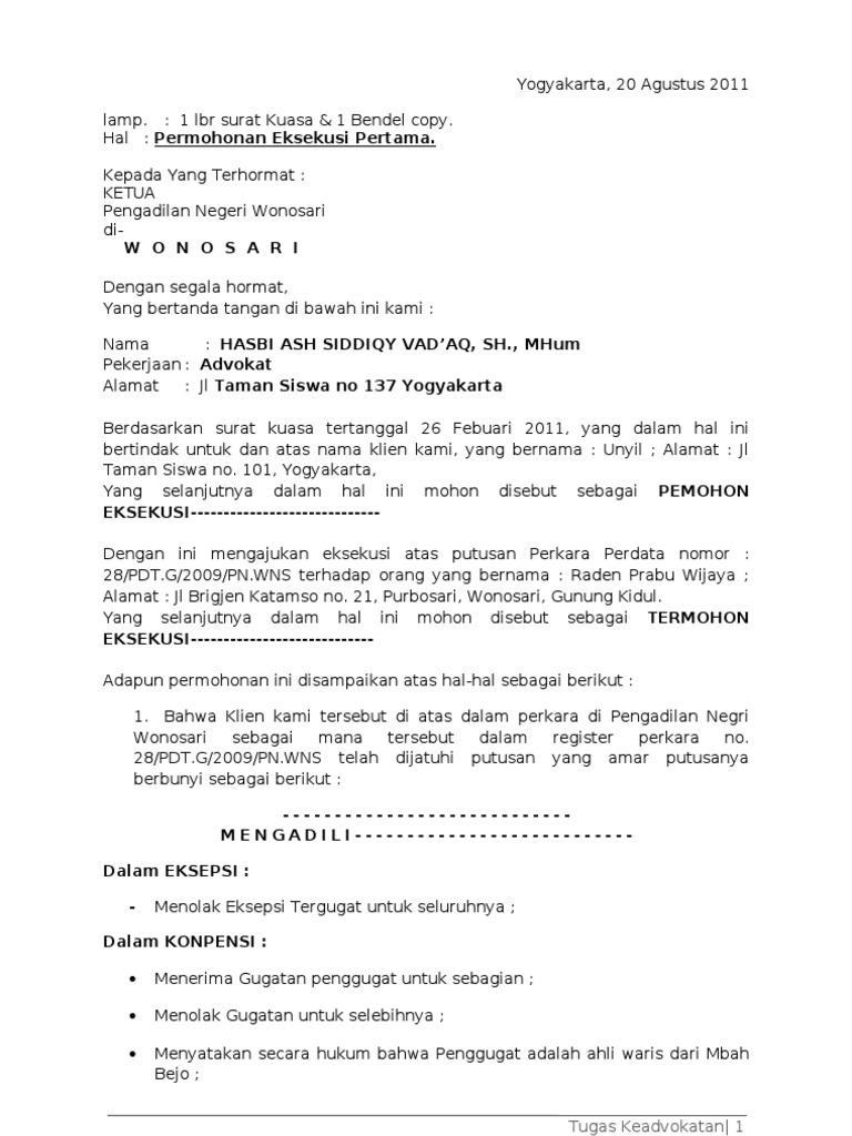 Contoh Surat Permohonan Eksekusi Putusan Phi