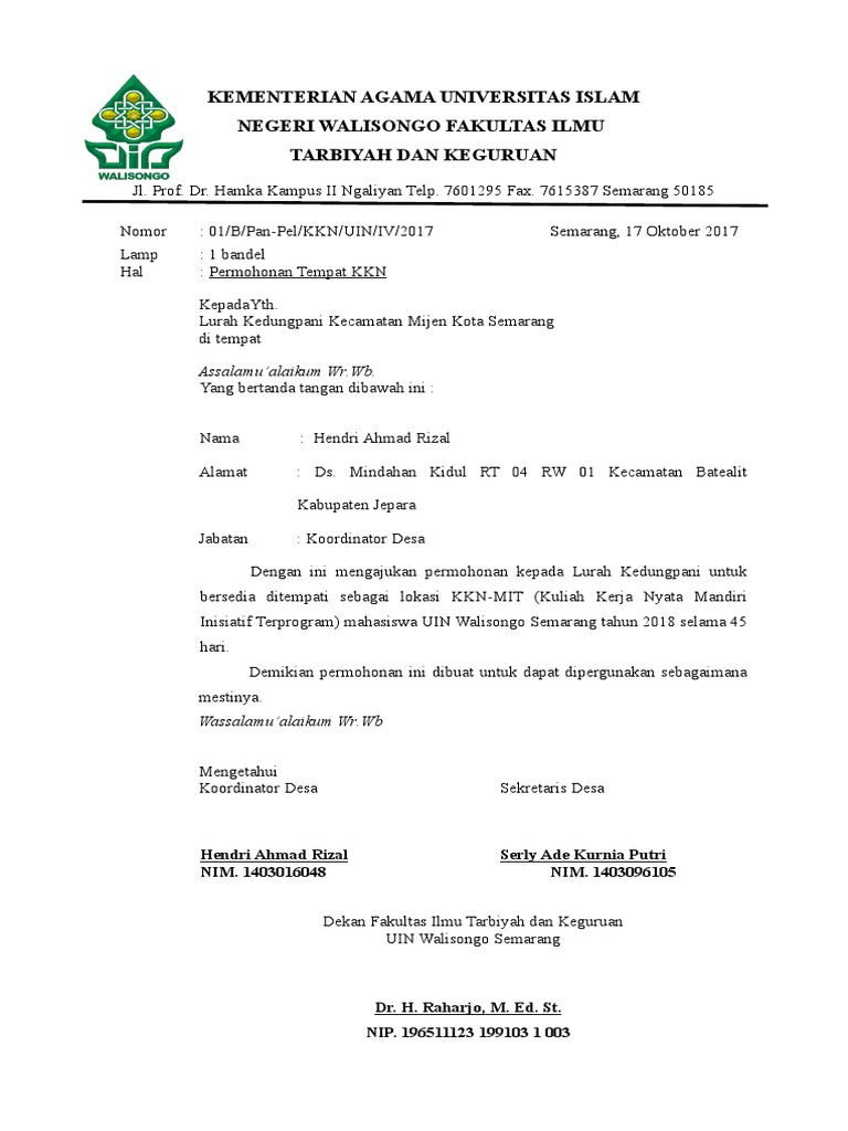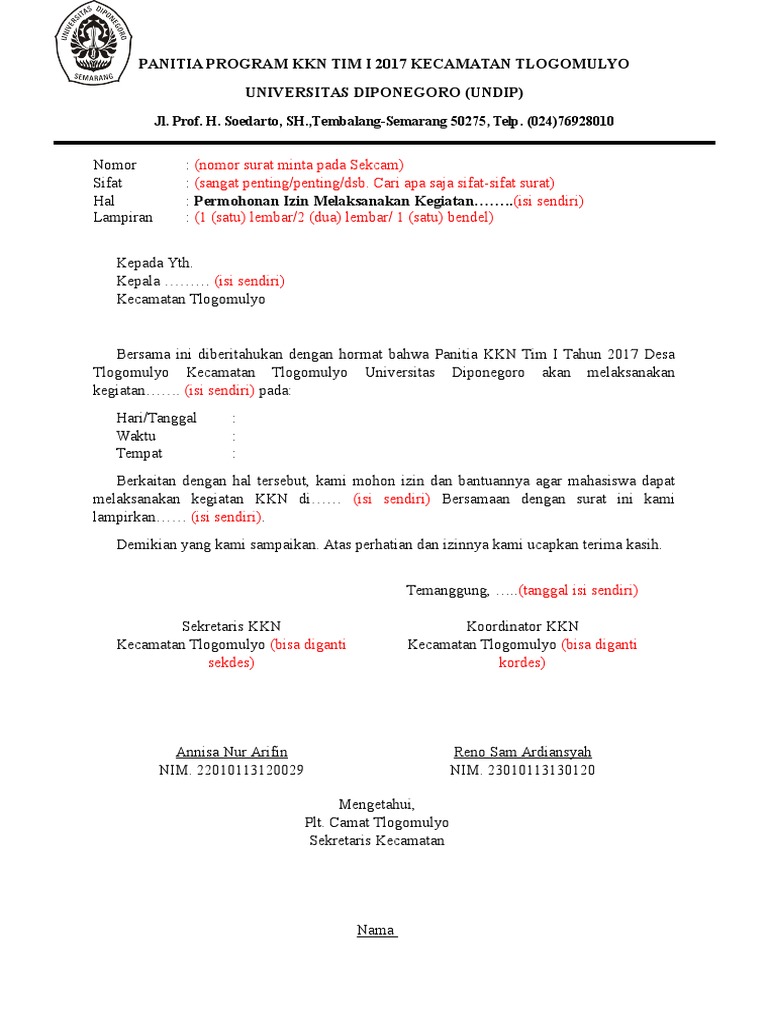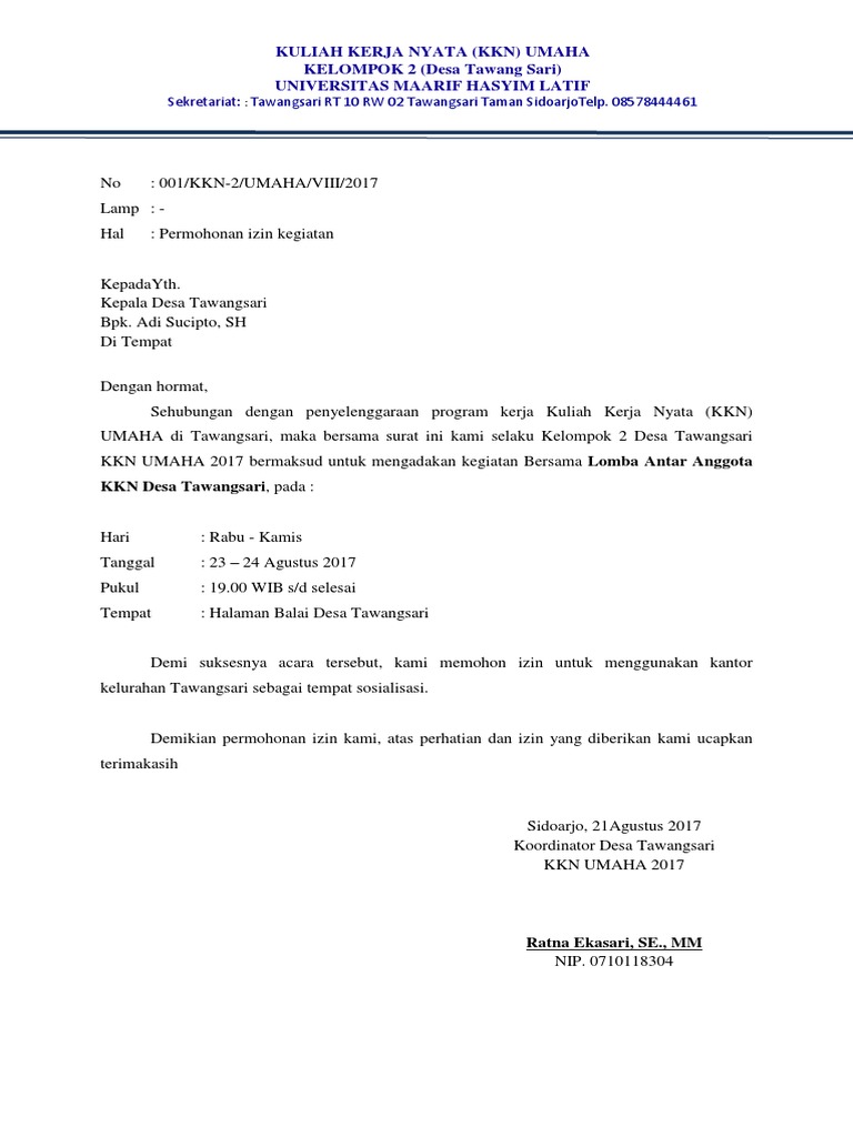 Sehubungan dengan kegiatan Kuliah Kerja NyataKKN Universitas Mulawarman dimana salah satu program kerja kami yaitu melaksanakan penyuluhan Keberihan. Contoh Surat Permohonan Tempat PPLKKN. Home AKTIVITAS Contoh Surat Permohonan Kegiatan KKN.