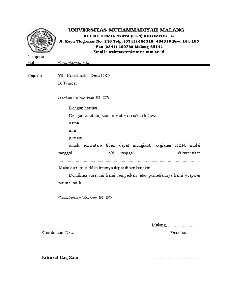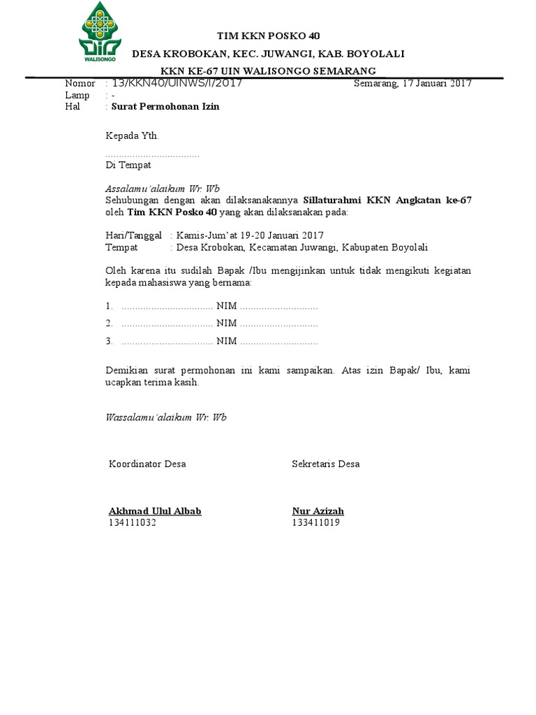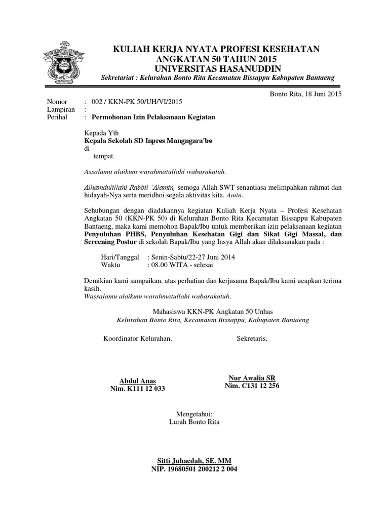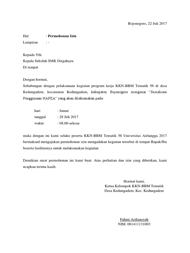 Demikian surat permohonan ini kami sampaikan atas perhatian BapakSaudara kami sampaikan terima kasih. Contoh Surat Izin Mengisi Kegiatan Sekolah oleh Mahasiswa KKN di Desa berikut ini adalah contoh dari Contoh Surat Izin Mengisi Kegiatan Sekolah oleh Mahasiswa KKN di Desa seperti contoh surat di bawah ini. Kelurahan Jawa Kecamatan Samarinda Ulu Kota Samarinda.