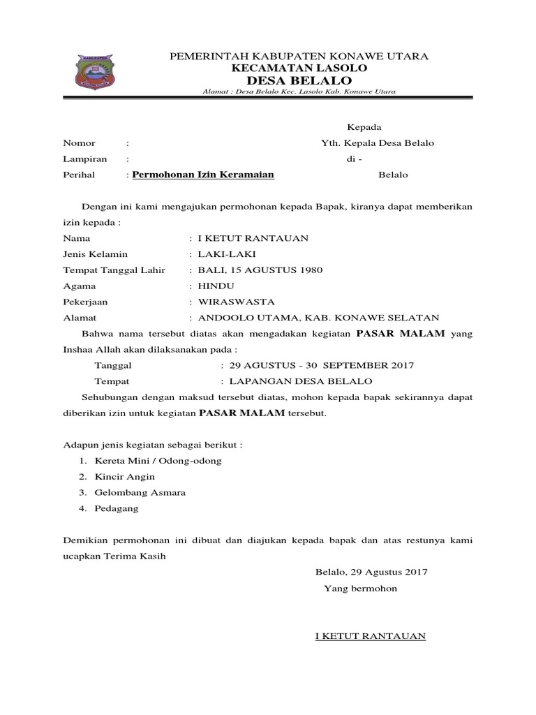 Contoh surat izin keramaian yang baik dan benar untuk kegiatan pesta pernikahan di kampung yang dapat diunduh secara gratis dan lengkap. Contoh Surat Permohonan Izin Kegiatan untuk Kepala Desa yang Baik dan Benar Terbaru Mei 2017 Berikut ini adalah sebuah contoh surat permohonan izin kegiatan atau acara yang ditujukan untuk kepala desa tempat diadakannya kegiatan. Demikian beberapa contoh surat izin keramaian yang dapat Anda jadikan referensi pembuatan surat resmi yang baik dan benar.