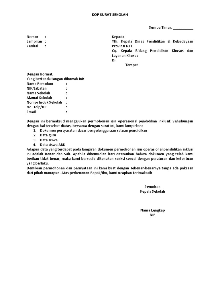 CONTOH SURAT PERMOHONAN IZIN OPERASIONAL SEKOLAH by kang7zuhdi. Untuk mengurus izin pendirian sekolah ini prosedurnya cukup mudah. Untuk contoh surat permohonan SK Ijin Operasional Sekolah dapat diunduh pada link di bawah ini.
