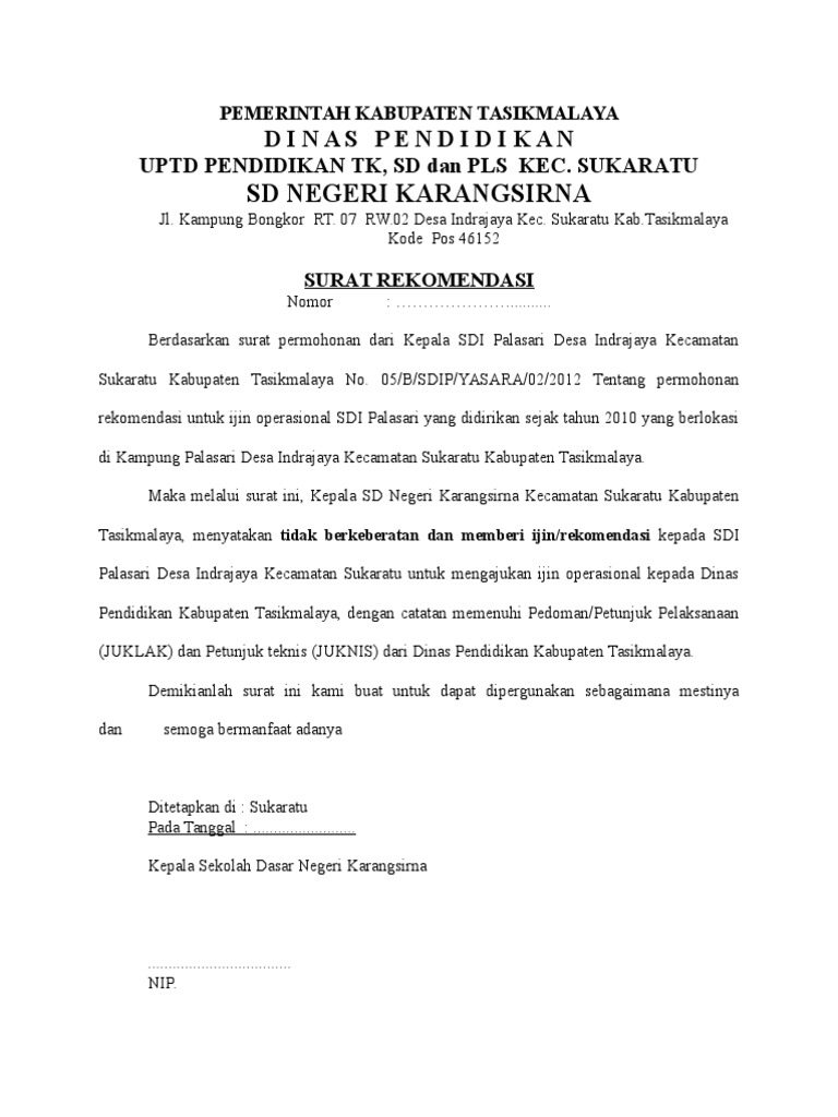 Surat Permohonan SK Ijin Operasional Sekolah harus mendapat rekomendasi dari kepala UPT pendidikan setempat sebelum diajukan ke Dinas Pendidikan KabupatenKota.