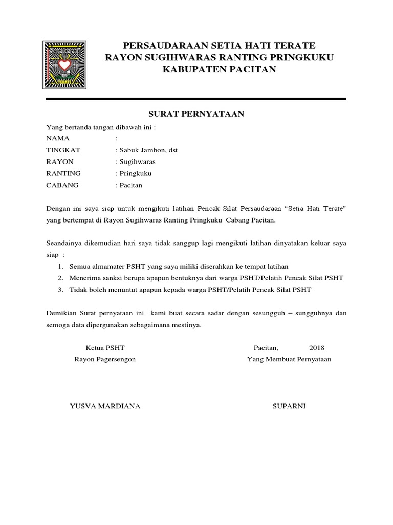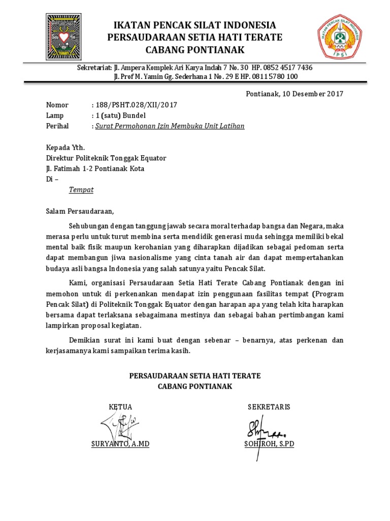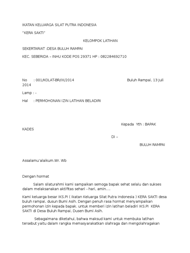 Contoh surat permohonan izin tempat latihan beladiri. Contoh surat permohonan izin tempat latihan pencak silat. Dengan hormat Kegiatan Latihan. Contoh paling sering ditemukan adalah surat permohonan izin dari panitia ekskul di sekolah kepada orang tua siswa.