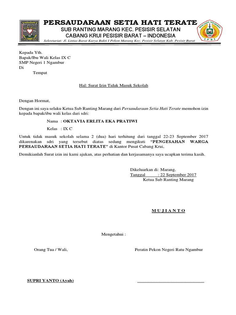 Kegiatan dan tempat kegiatan daftar isi tampil contoh surat permohonan izin seperti surat surat lainnya yang memiliki beragam jenis di sebabkan oleh tujuan pembuatan dan fungsi surat yang berbeda yang sebelumnya sudah di bahas di blog ini seperti surat permohonan bantuan. Contoh Surat Izin Tidak Masuk Sekolah Karena Acara Keluarga. Berikut informasi sepenuhnya tentang contoh surat permohonan izin tempat latihan iks pi.