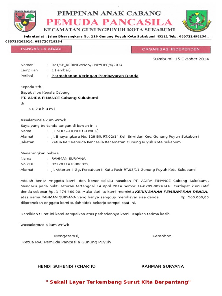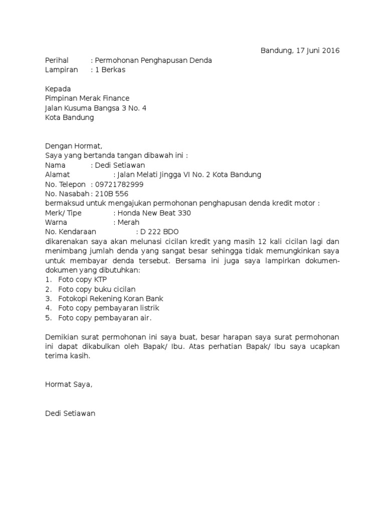 Awalnya nasabah dikenakan denda sekitar 17 juta kemudian leasing bersedia mengurangi denda sebesar 80 sehingga nasabah tersebut hanya membayar denda sebesar Rp. Permohonan keringanan ini terpaksa saya ajukan dikarenakan saya mengalami kesulitan mengangsur tiap bulannya memohon agar bank mandiri menghapuskan bunga pinjaman. Admin dari blog Contoh Seputar Surat 2019 juga mengumpulkan gambar-gambar lainnya terkait contoh surat permohonan penghapusan denda leasing dibawah ini.