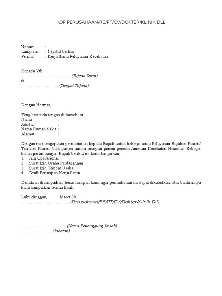 Contoh Surat Permohonan Kerjasama Rujukan Dengan Rumah Sakit