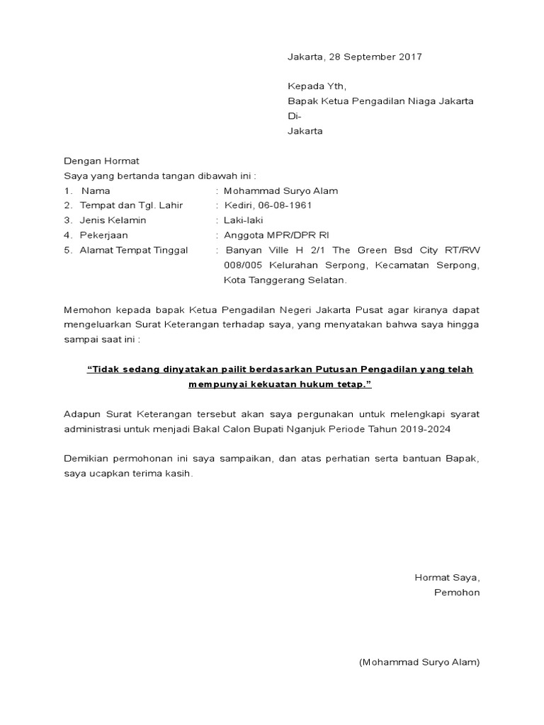 Adapun Surat Keterangan tersebut akan saya pergunakan untuk melengkapi syarat administrasi untuk menjadi Bakal Calon Bupati Nganjuk Periode Tahun 2019-2024.