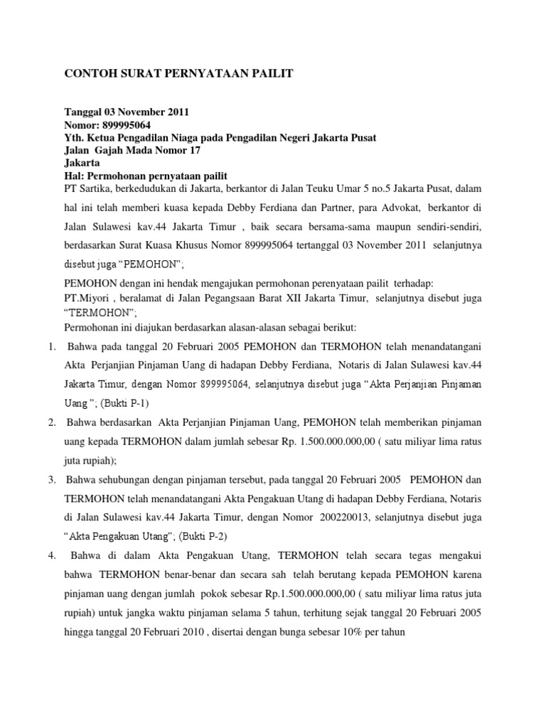 Selain lebih menghemat biaya penyampain informasi secara digital juga. Contoh Surat Pernyataan Pailit Terbaru. Saya perusahaan saya dan manajemennya tidak pernah dihukum dan tidak dalam pengawasan pengadilan berdasarkan putusan pengadilan atas tindakan yang berkaitan dengan kondite professional saya.