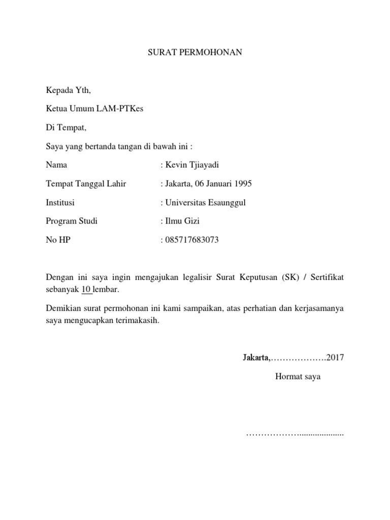 Contoh Surat Permohonan Legalisir Lam Ptkes