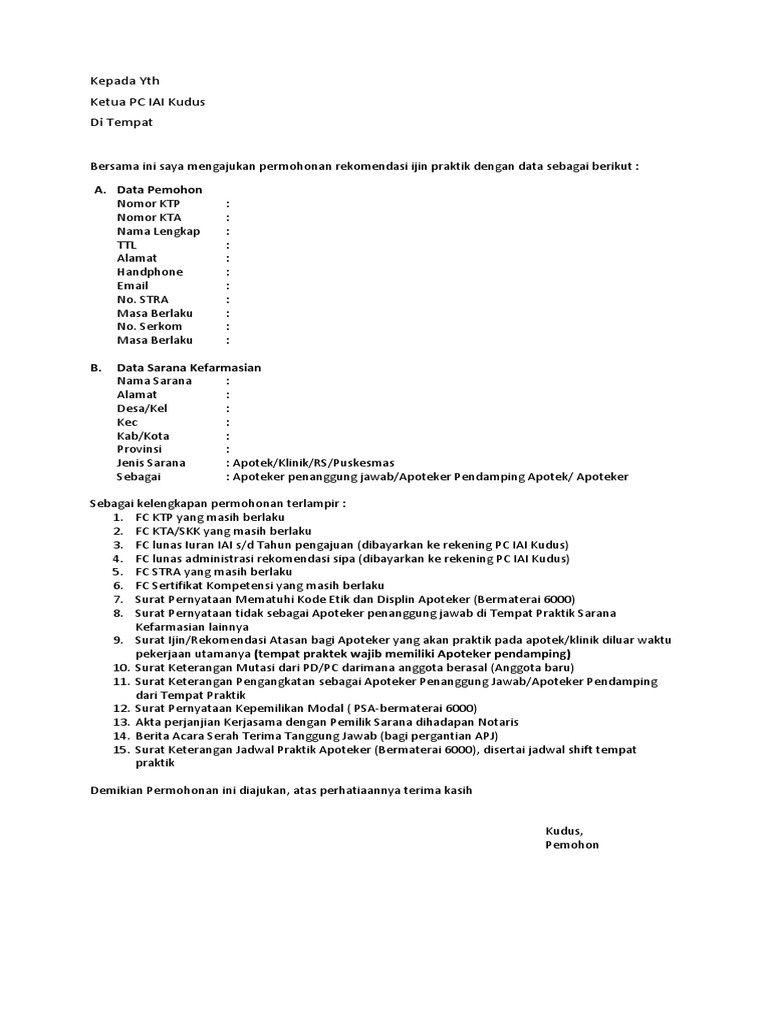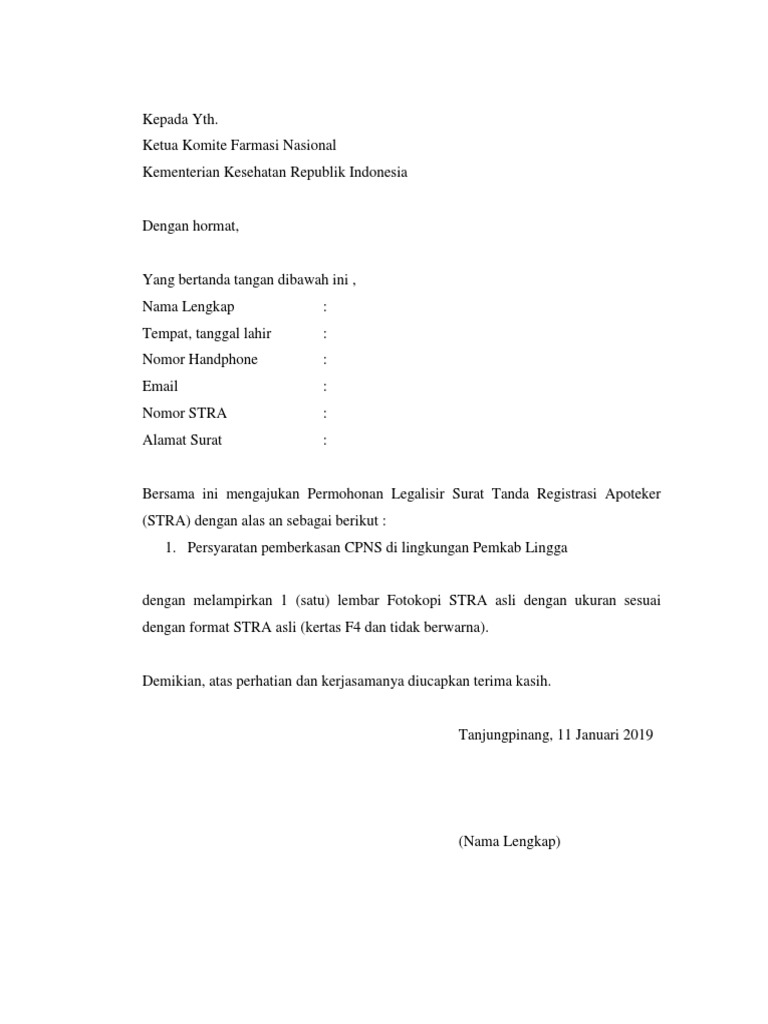 Ketua Komite Farmasi Nasional Kementerian Kesehatan Republik Indonesia Dengan hormat Yang bertanda tangan dibawah ini Nama Lengkap Tempat tanggal lahir Nomor Handphone Email Nomor STRA Alamat Surat Bersama ini mengajukan Permohonan Legalisir Surat Tanda Registrasi Apoteker STRA. Dengan adanya contoh ini silakan di modifikasi sesuai dengan. 99 contoh surat cinta romantis untuk senior pasangan.