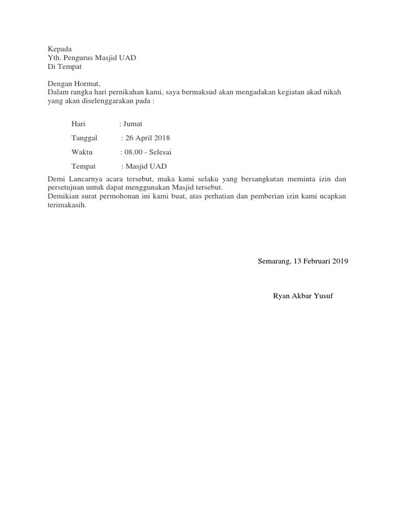 Contoh surat permohonan menikah di masjid. Terlebih lagi contoh-contoh diatas bisa dijadikan template atau referensi dalam membuat surat permohonan rekomendasi yang bisa digunakan untuk berbagai kebutuhan. Contoh Surat Cuti Menikah Pernikahan merupakan sesuatu hal yang tentu sangat dinanti nantikan setiap pasangan kekasih. Tidak heran jika harus ada banyak persiapan menjelang pernikahan sampai dengan dilaksanakannya pernikahan tersebut.