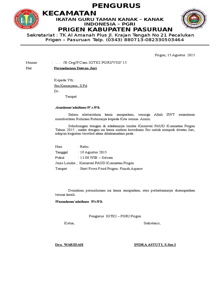 JlMoch Yasin Dusun Durian RT07RW02 Desa Mendalok Sungai Kunyit. Contoh surat permohonan menjadi dewan juri lomba maret 04 2017 remaja masjid darul jannah. Home contoh surat surat permohonan dewan juri surat permohonan dewan juri 0 comments panitia acara hut ri ke 68 untuk itu kami mengharapkan bapak ibu sekalian untuk hadir dan bersedia menjadi juri dalam kegiatan perlombaan cerdas cermat hijab tartil surat pendek pildacil adzan dan iqomah.