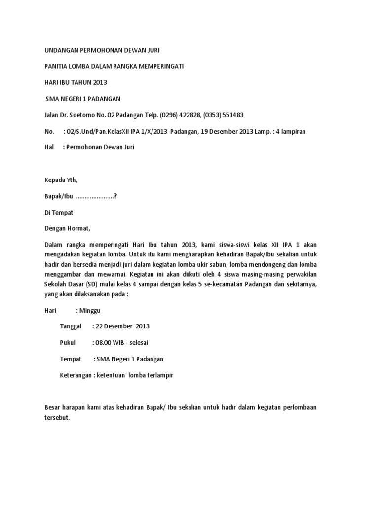 Salam sejahtera untuk kita semua semoga rahmat dan ridho-Nya selalu menaungi kita semua. Contoh Surat Undangan Dewan Juri Contoh Isi Undangan Miegames Surat Permohonan Dewan Juri. CONTOH SURAT PERMOHONAN MENJADI DEWAN JURI LOMBA Maret 04 2017 REMAJA MASJID DARUL JANNAH.