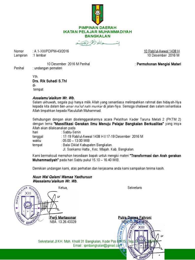Maka kami mengharapkan kesediaan kakanda untuk menjadi pemateri tentang Kemahasiswaan pada kegiatan tersebut yang insya Allah dilaksanakan pada. Contoh surat permohonan menjadi pemateri seminar pelatihan acara kegiatan himpunan mahasiswa berikut ini adalah contoh tentang contoh surat permohonan menjadi pemateri seminar pelatihan acara kegiatan himpunan mahasiswa seperti surat contoh yang tertulis di bawah ini. Kamu bisa mengajukan permohonan narasumber dengan menyampaikan surat permohonan kepada lembaga yang memiliki kapasitas untuk mengisi acara pelatihan atau workshop yang akan kamu adakan.