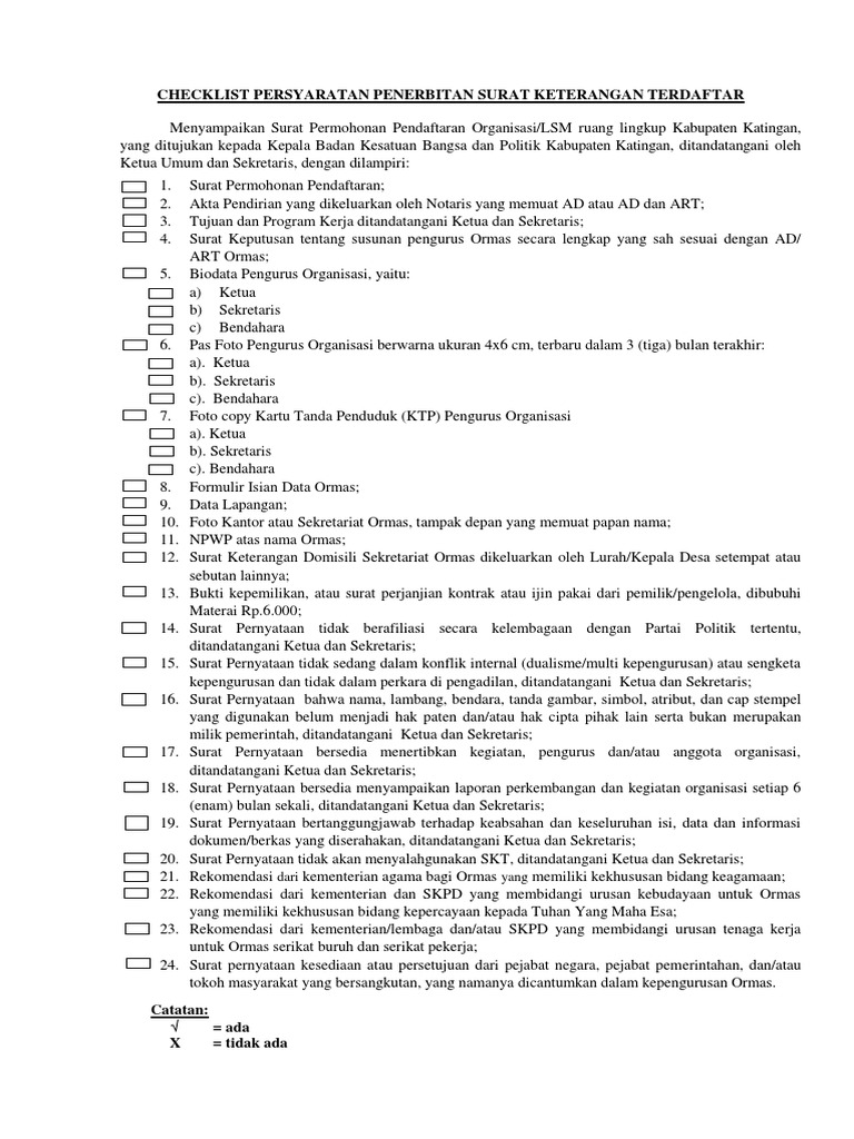 Kasubid Organisasi Kemasyarakatan Menerima Surat Yang telah ditandatangani dan diteruskan untuk dikirimkan ke Kementerian Dalam Negeri cqJendral Politik dan Pemerintahan Umum permohonan melalui surat elektronik. Download contoh form blangko untuk pengajuan izin operasional pendaftaran rumah tahfidz al-Quran berdasarkan SK Dirjen Pendis no 91 tahun 2020 dalam format doc ms word dapat diedit sesuai dengan data lembaga yang akan diajukan untuk mendapatkan SK Tanda Daftar Lembaga Pendidikan Al-Quran dan nomor statistik secara resmi. Contoh Permohonan Surat Keterangan Terdaftar SKT Untuk ORMAS - Bagi lembaga atau Organisasi Kemasyarakatan ORMAS yang baru didirikan jangan lupa untuk melaporkan ke Basan Kesatuan Bangsa dan Politik KESBANGPOL untuk memperoleh Surat Keterangan Terdaftar SKT sehingga keberadaan ORMAS juga diakui oleh pemerintahan daerah setempat.