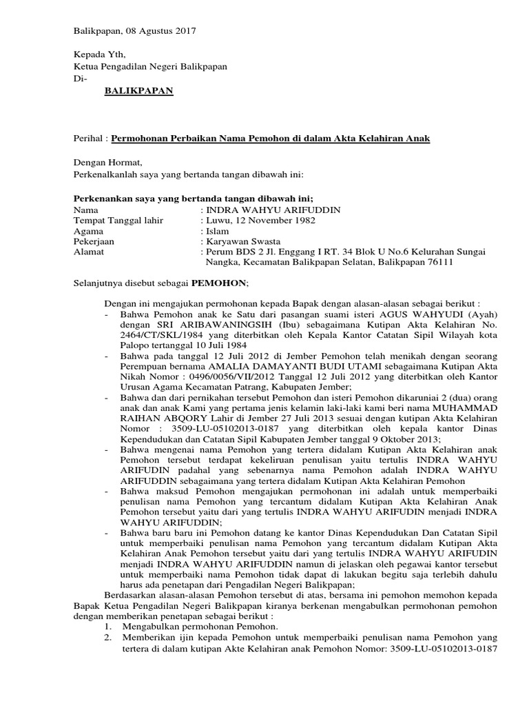 Kepada Yth Ketua Pengadilan Negeri Jakarta Timur. Beranda Contoh Surat Contoh Surat Perbaikan Akta Kelahiran September 24 2020 0 Komentar. Demikianlah Contoh Surat Permohonan Perbaikan Nama Terimakasih telah membaca artikel Contoh Surat Permohonan Perbaikan Nama Semoga contoh Surat Permohonan Perbaikan Nama ini dapat bermanfaat bagi anda yang membutuhkannya.