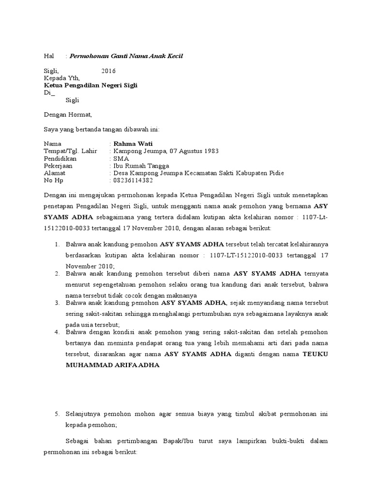 Selanjutnya saya akan memberikan contoh Surat Permohonan Penambahan Nama di Pengadilan Negeri. Untuk mendapatkan Surat Penetapan mengenai penggantian nama atau perubahan akta kelahiran dari Pengadilan Negeri tersebut tentunya harus memenuhi persyaratan. Contoh permohonan penetapan perubahan nama.