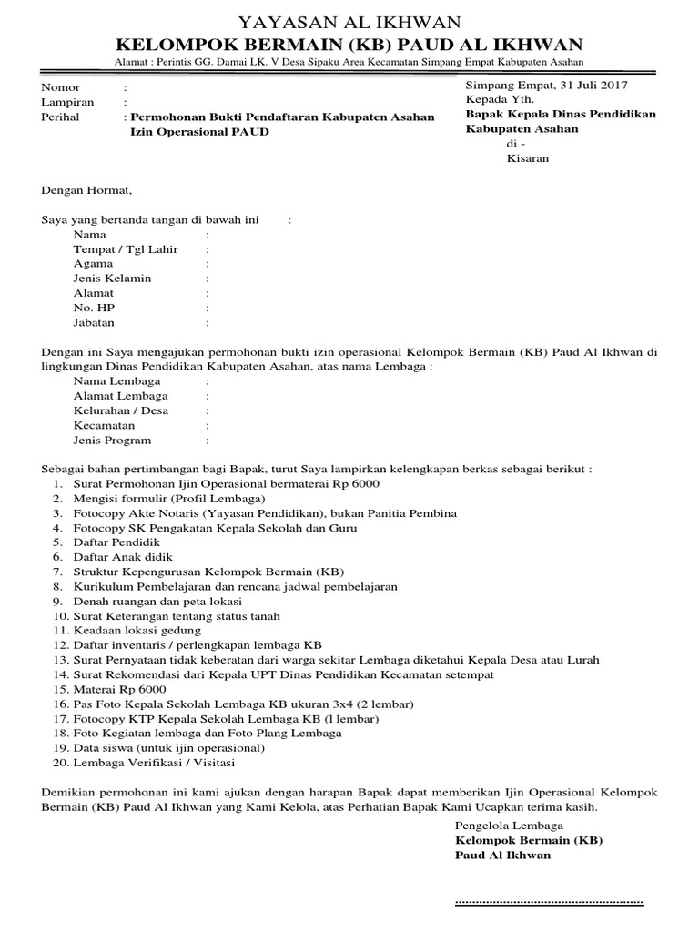 Surat Permohonan SK Ijin Operasional Sekolah harus mendapat rekomendasi dari kepala UPT pendidikan setempat sebelum diajukan ke Dinas Pendidikan KabupatenKota. Baik itu surat yang dipergunakan oleh perusahaan instansi pemerintahan lembaga organisasi dan perseorangan. Khusus permohonan izin operasional satuan pendidikan anak usia dini paud atau satuan paud sejenis yang berada di zona.