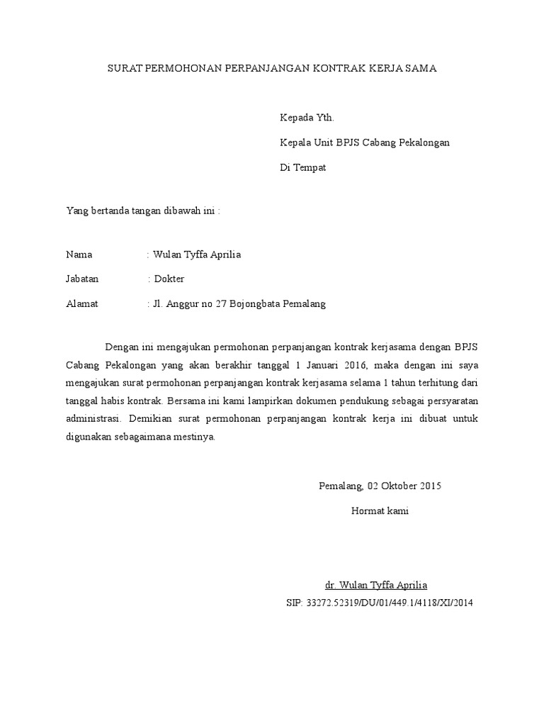 Tentang perjanjian kontrak Pekerjaan Pengadaan Judul Pengadaan BarangJasa yang akan berakhir pada tanggal Akhir tanggal kontrak maka dengan ini saya mengajukan surat permohonan perpanjangan kontrak kerja waktu pekerjaan selama 15 hari kalender disesuaikan dengan kemungkinan berapa lama pekerjaan akan selesai terhitung dari tanggal. Seperti diketahui publik contoh surat penambahan untuk bpjs ketenagakerjaan merupakan informasi yang sangat penting untuk diketahui bersama. Inilah rekomendasi tentang Contoh Surat Permohonan Kerjasama Apotek Dengan Bpjs.