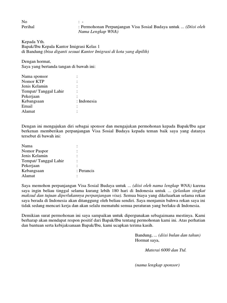 Contoh surat permohonan perpanjangan visa sosial budaya. Surat sponsor untuk apply visa Sosial Budaya harus ada keterangan atas persetujuan dari kantor Imigrasi terdekat. Paspor asli dan fotocopi paspor halaman identitas visa dan cap kedatangan. Berikut informasi sepenuhnya tentang contoh surat permohonan visa sosial budaya.