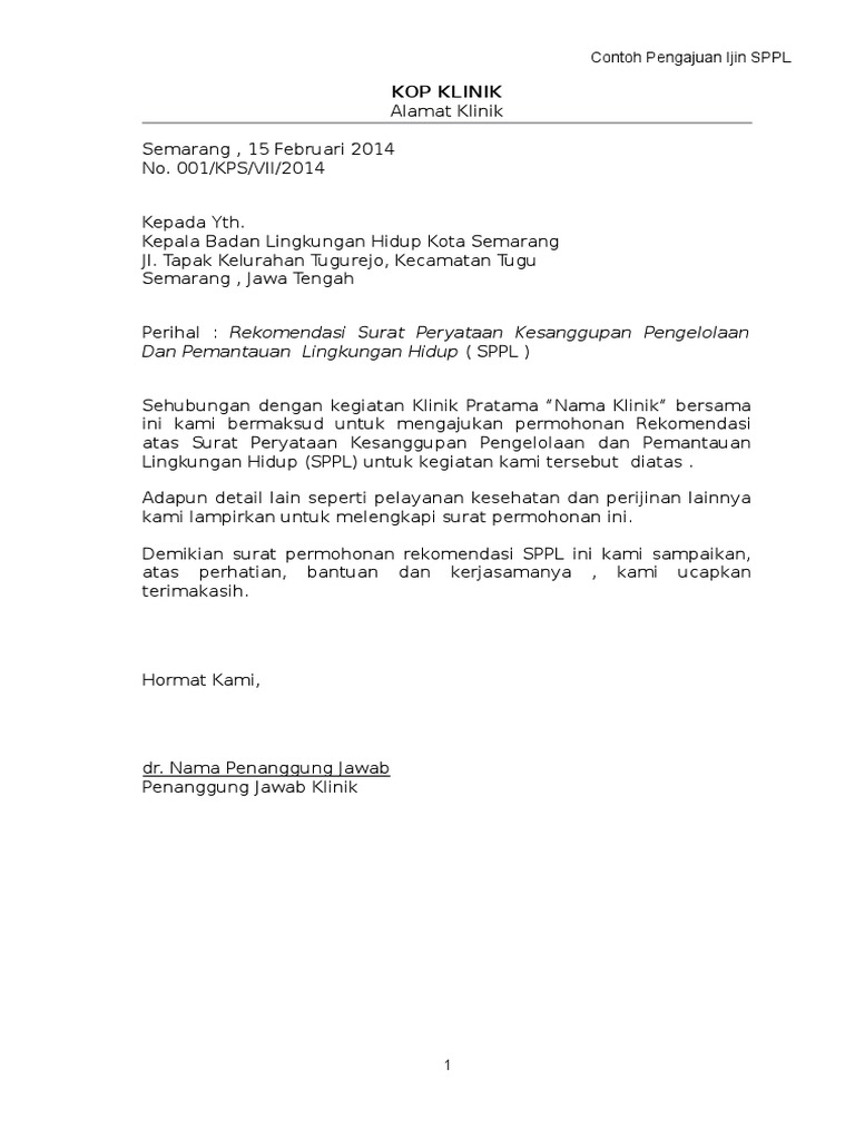 SURAT PERMOHONAN PERSETUJUAN PENGELOLAAN DAN PEMANTAUAN LINGKUNGAN HIDUP SPPL Depok Tanggal Bulan Tahun Saya yang bertanda tangan d i bawah ini. Berikut ini Contoh Surat yang baik dan benar serta menarik perhatian yang dapat anda gunakan dalam tema maupun format penulisan surat. Sebenarnya ada sangat banyak contoh surat permohonan rekomendasi yang mungkin anda butuhkan mulai dari keperluan.