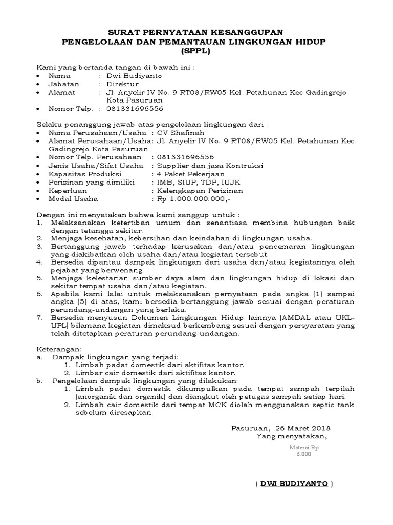Fotocopy Bukti Kepemilikan Tanah. Itulah beberapa contoh surat permohonan untuk berbagai kepentingan yang dapat kamu jadikan rujukan dalam membuat surat permohonan. Surat Pernyataan Kesanggupan Pengelolaan dan Pemantauan Lingkungan Hidup yang selanjutnya disebut SPPL adalah pernyataan kesanggupan dari penanggungjawab usaha danatau kegiatan untuk melakukan pengelolaan dan pemantauan lingkungan hidup atas dampak lingkungan hidup dari usaha danatau kegiatannya di luar usaha danatau kegiatan wajib AMDAL atau UKL-UPL Pasal 1 Permen LH 16.