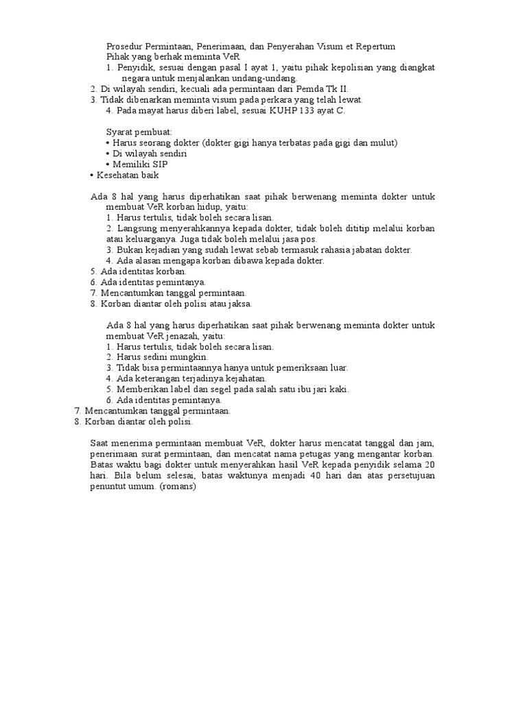Patologi forensik atas permintaan penyidik yang berwenang mengenai hasil pemeriksaan medik terhadap manusia baik hidup atau mati ataupun bagian atau diduga bagian tubuh manusia berdasarkan keilmuannya dan di bawah sumpah untuk kepentingan pro yustisia. Imagesbentuk Surat Visum Et Repertum. 4 April 2010 a b benar3 Sementara dari hasil penelitian di Pekanbaru tidak satupun dokter pemeriksa VeR yang mencantumkan kualifikasi luka menurut rumusan pasal 351 352 dan 90 Kitab.