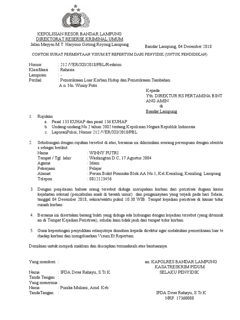 Contoh surat permohonan visum et repertum. Identitas tempat pembuatan visum berdasarkan surat permohonan mengenai jam tanggal dan tempat. Contoh surat visum et repertum. PRO JUSTITIA Nomor Surat Keterangan VeR.