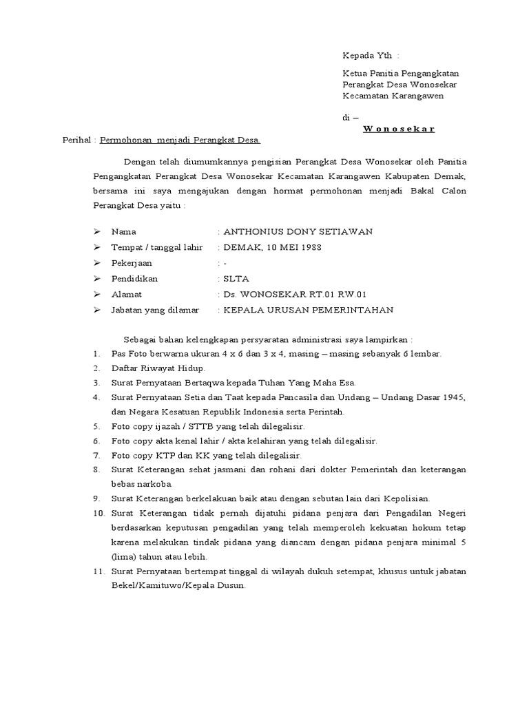 Kop surat ini mengandung identitas dari lembaga atau instansi yang mengirim surat permohonan tersebut. Dengan hormat Bersama dengan ini saya Akhmad Muhlisin bermaksud mengajukan permohonan untuk mengundurkan diri dari jabatan perangkat dan aparat Desa Karanggayam. Contoh Surat Lamaran Perangkat Desa 2020 - Dalam pengisianseleksi penjaringan dan penyaringan jabatan Perangkat Desa salah satu syarat administrasi yang harus dilengkapi oleh bakal calon Perangkat Desa adalah Surat LamaranSurat Permohonan.