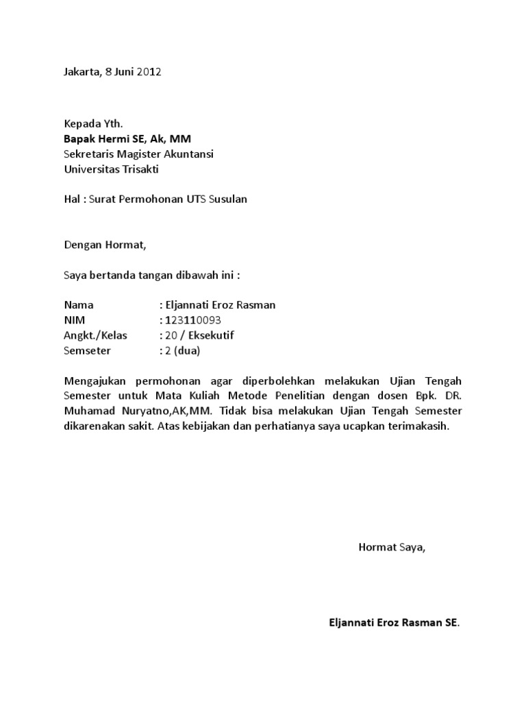 Surat Permohonan Ujian Susulan Palembang 21 Desember 2017 Kepada Yth. Fakultas Ekonomi Bisnis Prodi Magister Manajemen. Surat Permohonan Berikut adalah banyak templat surat yang dapat Anda jadikan referensi yang tepat.