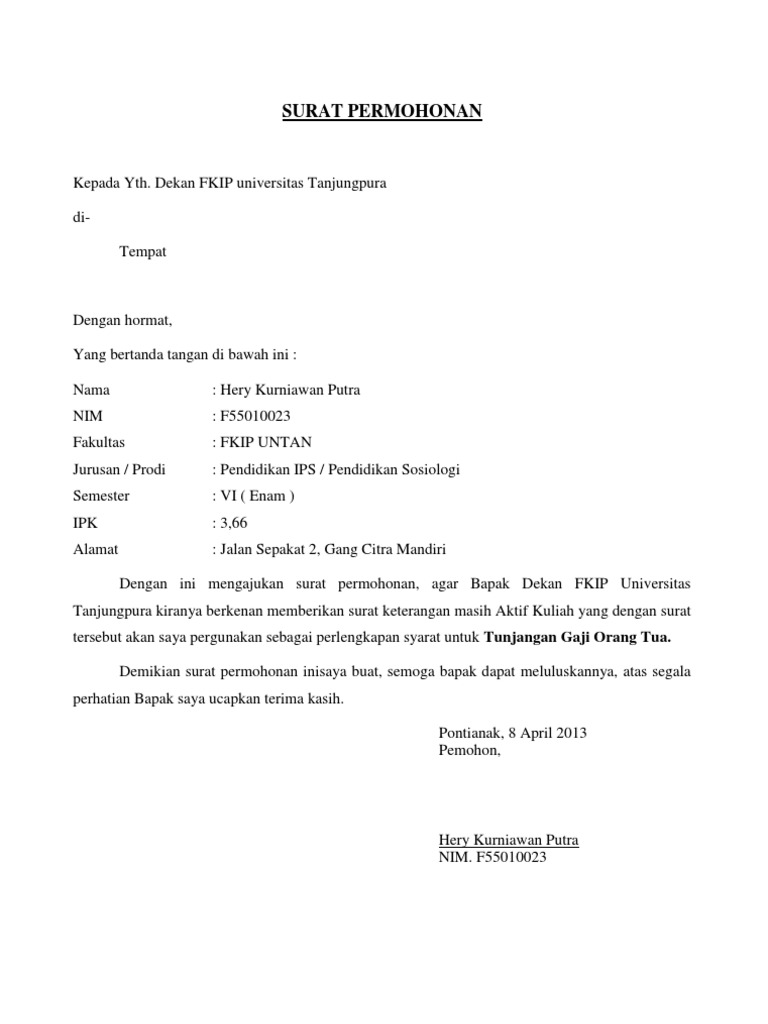 51 Mahasiswa mengajukan permohonan aktif kuliah kembali ke dekan berdasarkan rekomendasi jurusan. Untuk mendapatkan file contoh surat permohonan aktif kuliah yang tidak diproteksi dan bebas untuk diedit silahkan anda kunjungi situs kami. Hukum Tata Negara HTN.