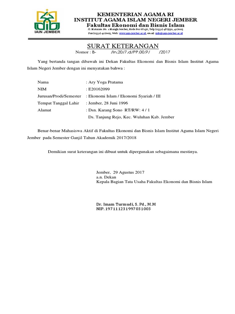 Contoh Surat Keterangan Aktif Kuliah Mahasiswa Kampus Untuk Syarat Seleksi berikut ini adalah contoh tentang Calon Contoh Surat Keterangan Aktif Kuliah Mahasiswa Kampus Untuk Syarat Seleksi Calon. Endro Suratmin Sukarame Kota Bandar Lampung Indonesia T. Wakil Dekan I FTP ttd 26 Januari 2018 3.