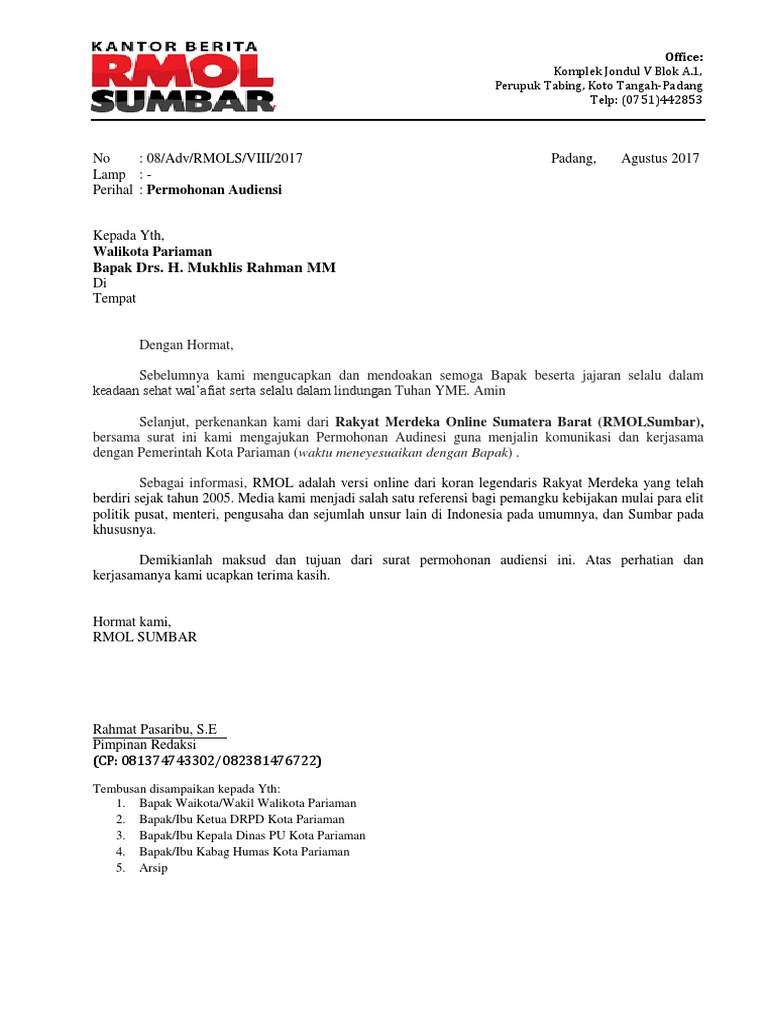 Surat permohonan berisi tentang sebuah permintaan tentang sesuatu hal kepada pihak yang bersangkutan perseorangan badan atau lembaga organisasi perusahaan atau instansi dan lainnya. Surat audiensi hmi contoh surat audiensi karang taruna ke perusahaan contoh surat audiensi ke bupati contoh surat audiensi ke camat contoh surat audiensi ke perusahaan contoh surat audiensi ke polres contoh surat audiensi ke presiden. Kemungkinan jenis surat permohonan yang akan kamu buat atau kamu urus berbeda tapi tidak usah bingung kamu cukup menyesuaikannya dengan contoh yang kami berikan di atas.