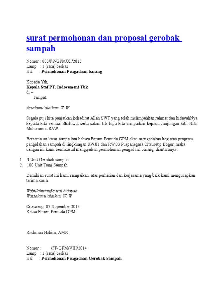 Surat permohonan bantuan bak sampah. Admin blog Berbagi Contoh Proposal 2019 juga mengumpulkan gambar-gambar lainnya terkait contoh proposal pengajuan bantuan tempat sampah dibawah ini. Proposal bantuan motor gerobak sampah. Selain dari itu surat permohonan juga memiliki fungsi sebagai bukti tulis bahwa kita melakukan atau membuat permohonan yang diberikan kepada pihak yang bersangkutan atau terkait agar sesuatu tujuan yang kita sampaikan tersebut dapat tercapai dan.