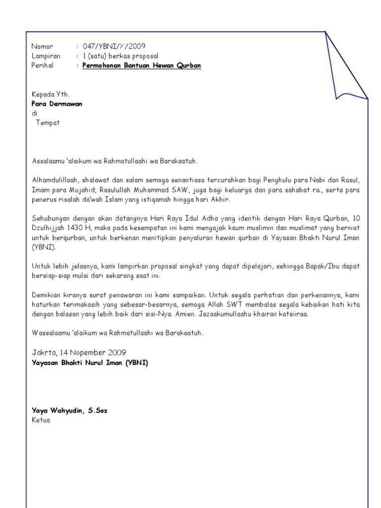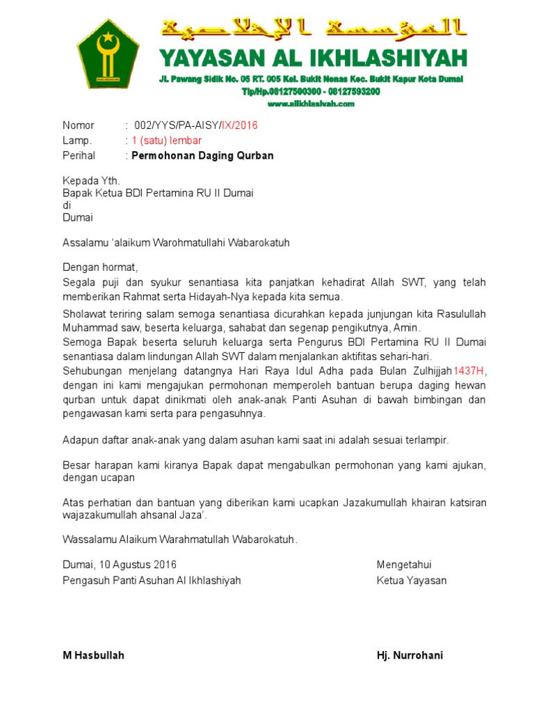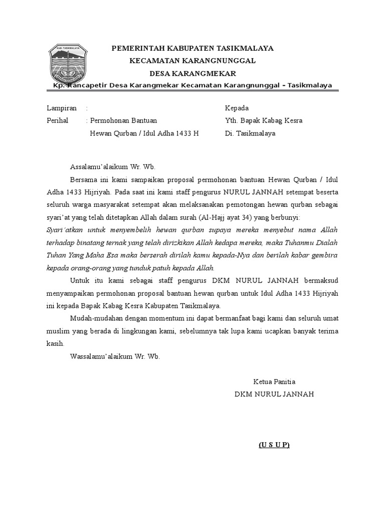 Surat permohonan bantuan daging kurban. 4Contoh PROPOSAL IDUL QURBAN 1432 H. Anda di halaman 1 dari 2. Kumpulan Contoh Surat Permohonan Hewan Qurban yang Benar 2019.
