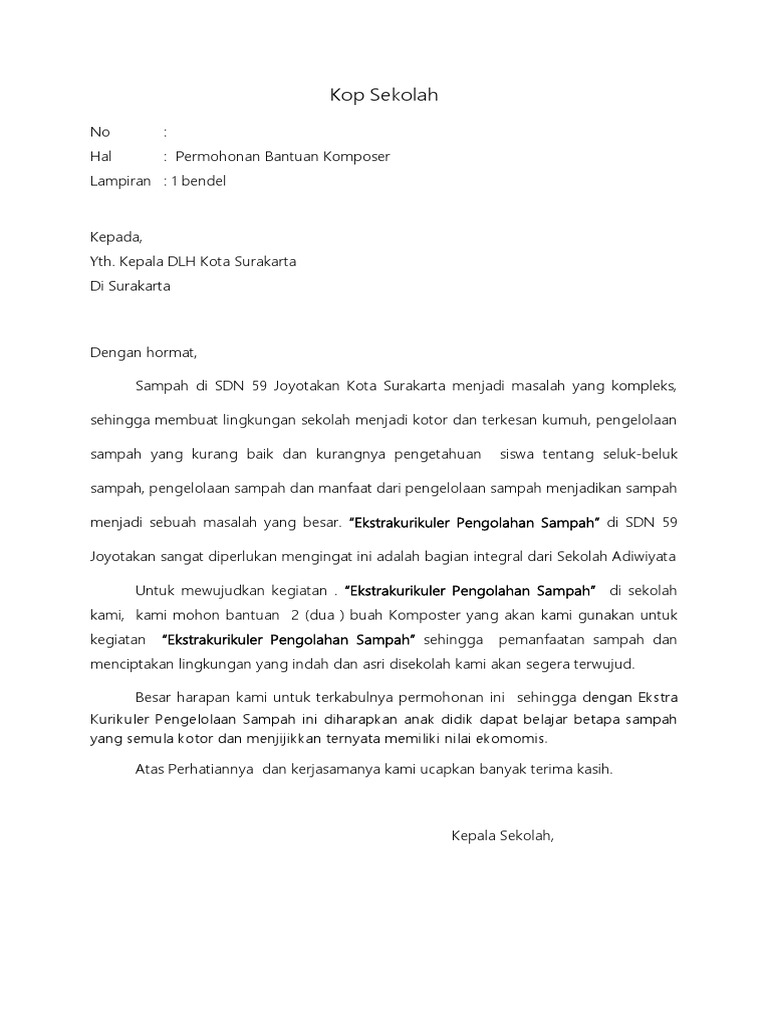 Surat permohonan bantuan tempat sampah untuk sekolah. Kabir Ala Maulana TempatTanggal Lahir Bantul 20 Maret 1995 Sekolah Asal SMA. Inilah yang dapat kami bagi terkait proposal permohonan bantuan tempat sampah untuk sekolah. Contoh Surat Rasmi Permohonan Tong Sampah Contoh surat rasmi permohonan contoh surat rasmi permohonan cuti contoh surat rasmi permohonan kerja contoh surat rasmi rayuan contoh su.