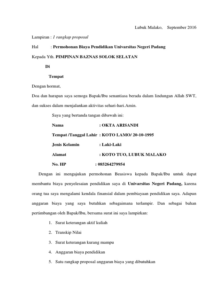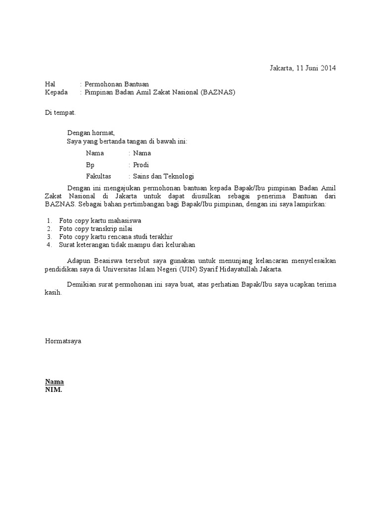 Contoh Proposal Permohonan Dana Studi Di Timur Tengah Esi. Dengan ini mengajukan permohonan bantuan kepada Bapak Ibu pimpinan Badan Amil Zakat Nasional di Padang untuk dapat diusulkan sebagai penerima Bantuan dari BAZNAS. Mencari informasi terkait Contoh Surat Permohonan Bantuan Dana Pendidikan Ke Baznas.