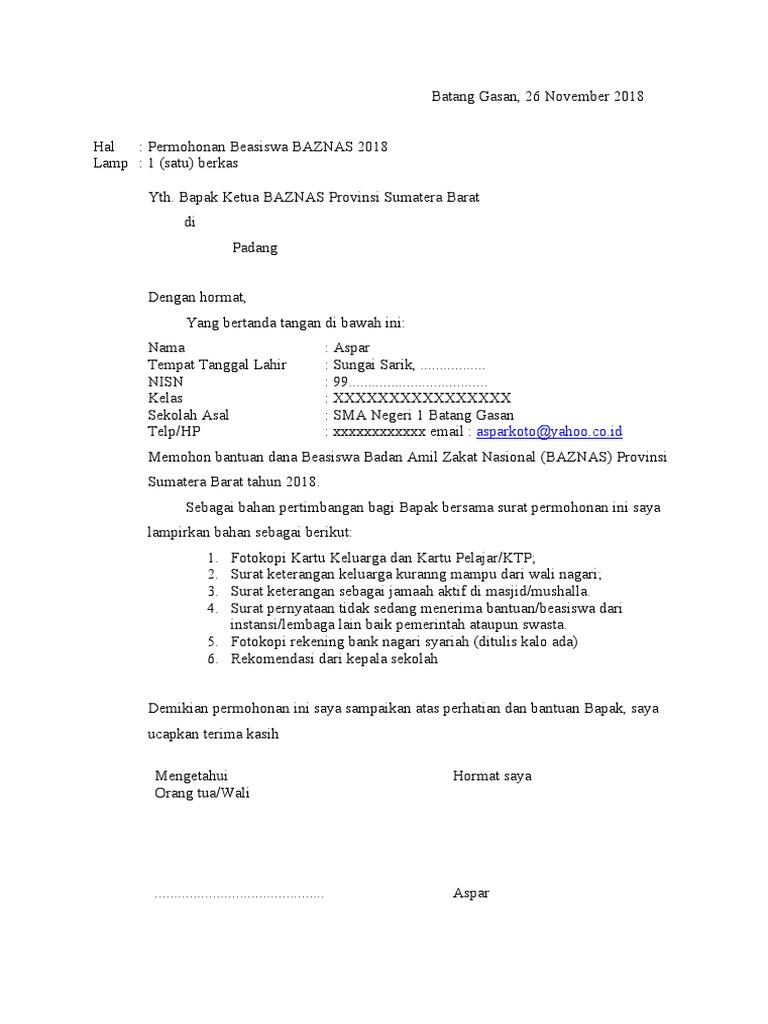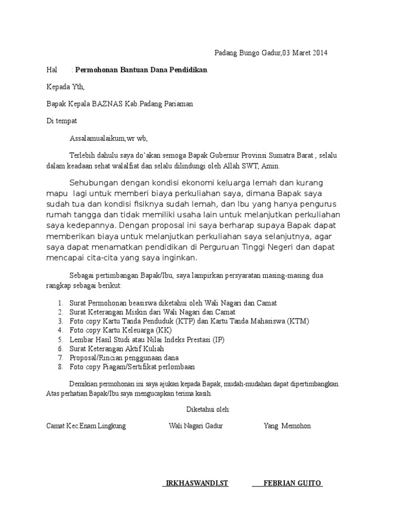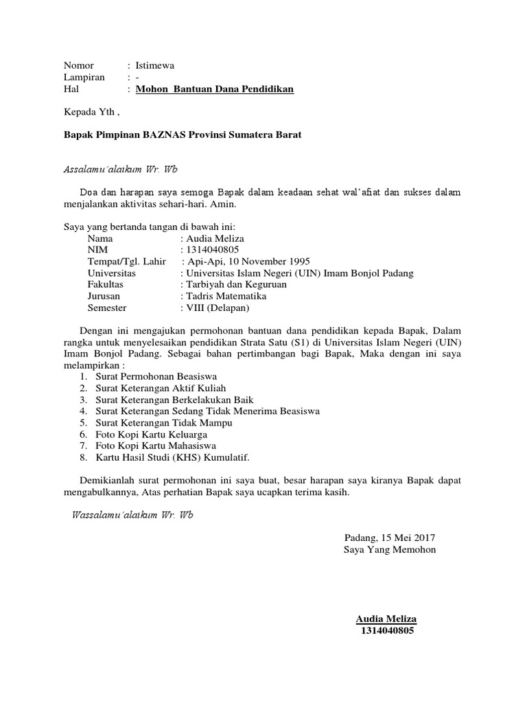 - Permohonan ditujukan ke Ketua Baznas Pessel dan Ditandatangani - Surat keterangan kurang mampumiskin dari wali nagari Asli - Surat keterangan aktif kuliah dari kampus asli - Surat keterangan tidak menerima beasiswa dari kampus asli - Fotocopy nilai terakhir IP minimal PTN. Admin surat permohonan nya ini ntar di kasih kemana. 8 Tahun 2001 yang memiliki tugas dan fungsi menghimpun dan menyalurkan zakat infaq dan sedekah ZIS pada tingkat nasional.