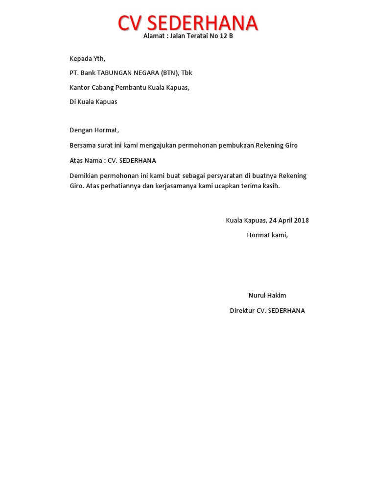 Dengan hormat Bersama surat ini kami atas nama CV. Contoh Surat Permohonan Pembukaan Rekening Giro Tentu kamu sudah mengetahui rekening giro merupakan salah satu produk perbankan yang sangat penting khususnya bagi instansi baik itu sekolah pemerintah atau perusahaan. Contoh surat permohonan pembukaan rekening bank ny 1220 am.