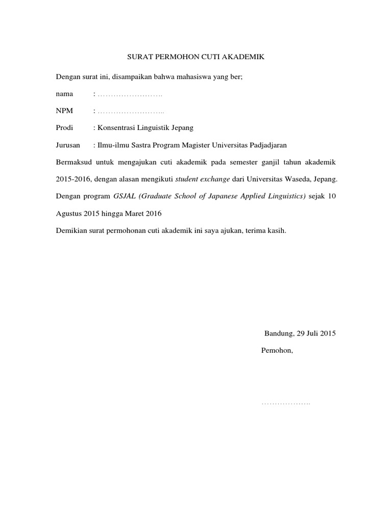 Di luar waktu yang ditentukan mahasiswa tidak dilayani. Contoh Surat Permohonan Cuti Kuliah Doc have a graphic from the otherContoh Surat Permohonan Cuti Kuliah Doc In addition it will feature a picture of a kind that may be seen in the gallery of Contoh Surat Permohonan Cuti Kuliah Doc. Pengajuan cuti kuliah adalah pengajuan untuk tidak mengikuti kuliah selama satu semester atau sebanyak-banyaknya 2 semester selama masa studi c uti kuliah diperbolehkan minimal semester tiga 2.