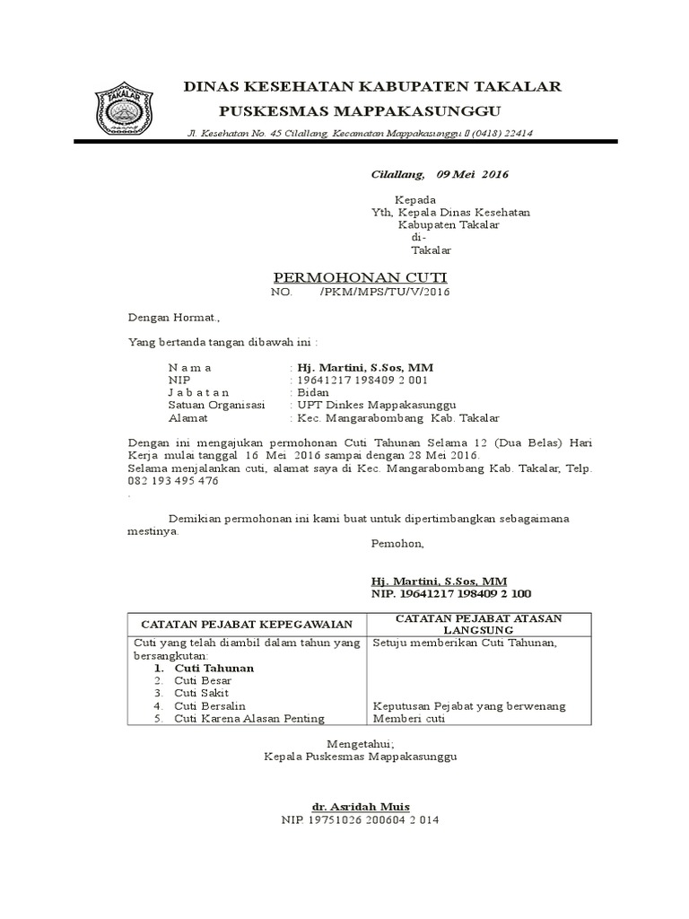 Bagi perusahaan tentu perlu memberikan fasilitas yang memudakan karyawan untuk mengajukan cuti. Format Surat Izin Cuti Sakit. Cuti Sakit Lanjutan diberi untuk berehat di rumah atau di hospital kerana tidak sihat untuk bertugas disebabkan sakit atau kecederaan yang ada harapan untuk sembuh tidak melebihi 3 bulan dengan Perakuan Lembaga.