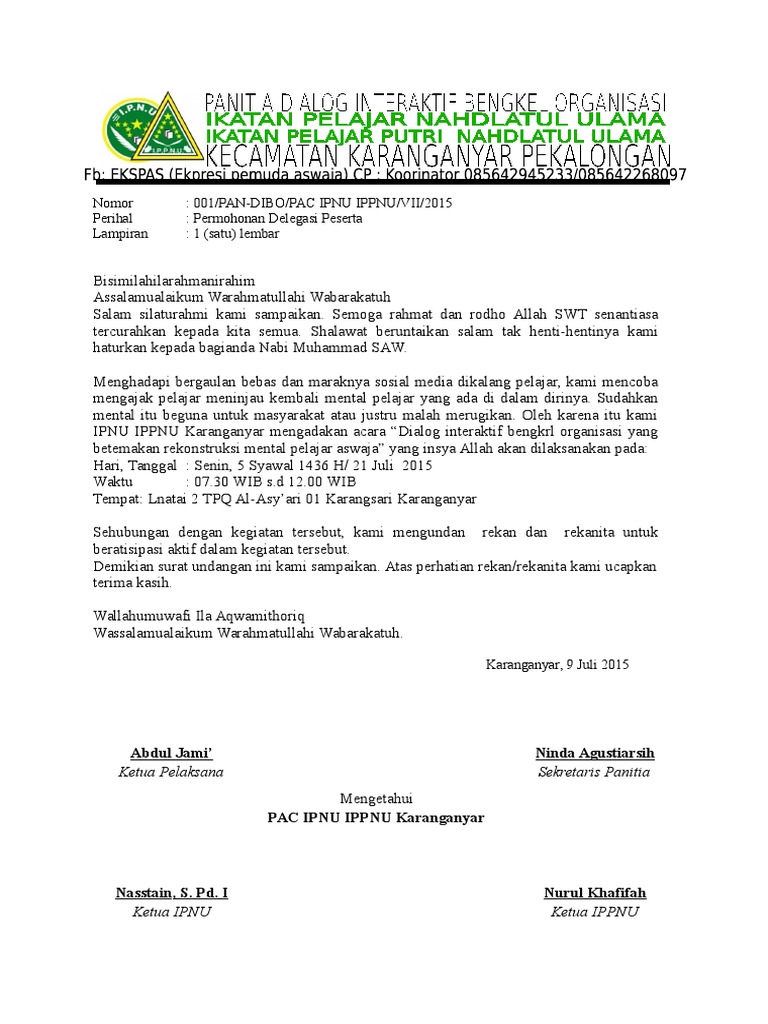 Bersama ini kami Panitia Masa Kesetian Anggoata MAKESTA IPNU-IPPNU Ranting Kejambon memohon kesediaan Bapak untuk menjadi Narasumber sekaligus membuatkan Makalah materi yang diampu dalam kegiatan tersebut diatas adapun jadwal terlampir Demikian permohonan ini kami sampaikan atas kesediannya kami sampaikan terima kasih. 28 Surat Ipnu Surat Ipnusurat Permohonan Ijin. Kegiatan ini merupakan suatu arah agar terbentuk cikal bakal kaker-kader yang handal dan profesional siap pakai khususnya dalam kepengurusan IPNU-IPPNU serta umumnya untuk masyarakat indonesia.