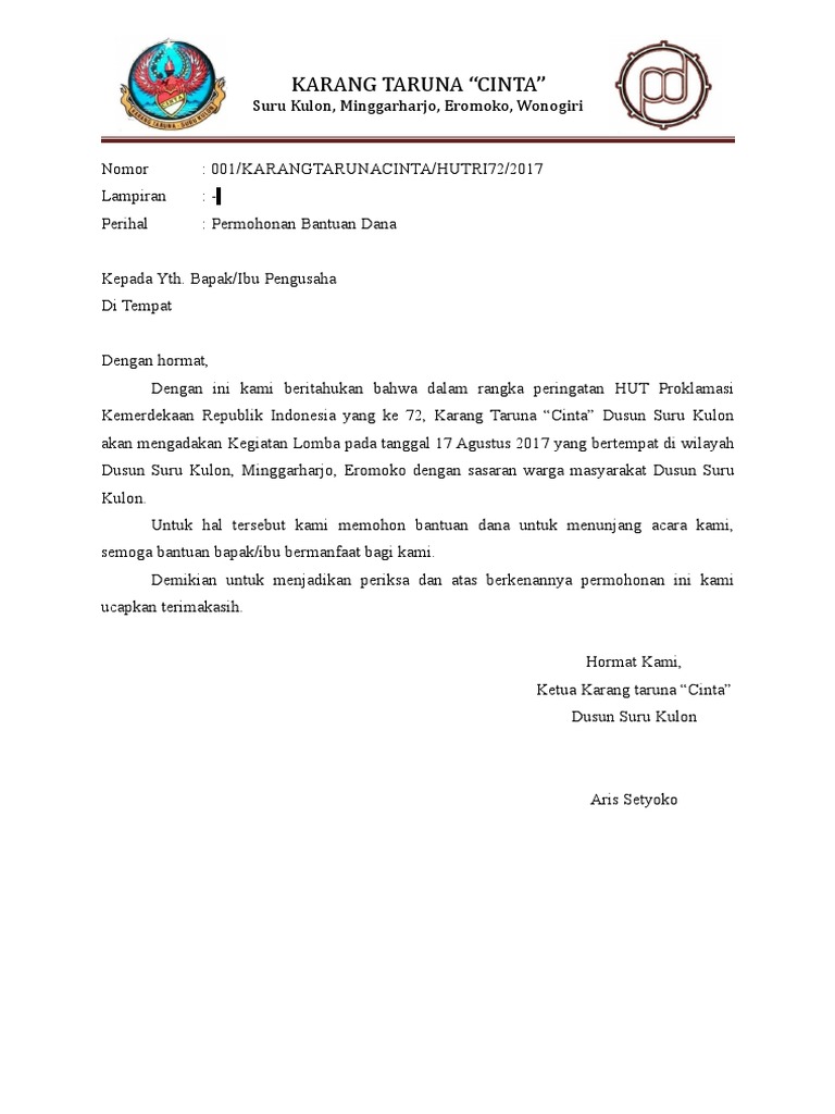 Contoh surat permohonan bantuan dana kegiatan 17 Agustus. Surat Permohonan Karang Taruna. Bantuan yang dimaksud memang seringkali dikaitkan dengan bantuan dana walaupun tidak selamanya demikian.